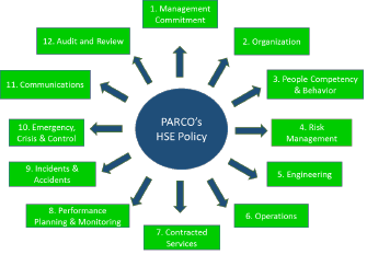 PARCO میں HSE مینجمنٹ سسٹم (HSEMS) کو HSEQ پالیسی میں بیان کردہ اہم شعبوں سے اخذ کردہ 12 عناصر پر مشتمل ’’درخت‘‘کے طور پر تصور کیا جا سکتا ہے۔ ہر عنصر مخصوص مقاصد اور توقعات کا تعین کرتا ہے، جو کمپنی کے روزانہ کی کارروائیوں کی منصوبہ بندی، انتظام/عملدرآمد، نگرانی، اور تشخیص کے دوران پورا ہونا ضروری ہے۔